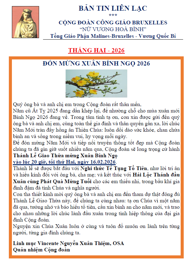 Vào ngày Chúa Nhật 18/05/2025 sắp tới, Cộng Đoàn chúng ta sẽ hân hoan long trọng mừng lễ Đức Mẹ Nữ Vương Hoà Bình, là Quan Thầy và Bổn Mạng của Cộng Đoàn chúng ta.